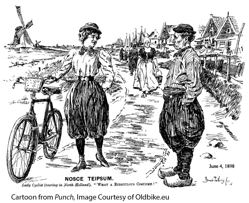 There is still something magical about getting on a bicycle and flying off down the road, regardless of one’s gender identity. Imagine how it might have felt to a woman who lived in a world without many transportation choices, where gender roles for women were far more restrictive than they are today. Women had to find ways to define bicycling as an acceptable activity for a “lady.” They had to learn how to ride, figure out what to wear, and some had to convince their fathers or husbands that bicycling was a reasonable activity. Considering bicycling clothing was necessary for practical reasons (how do you ride in a skirt?), but clothing was also a language that most women spoke. Linking it to bicycling made bicycling seem more accessible. Which brings me to why on earth I would want to write about bicycles and dress.